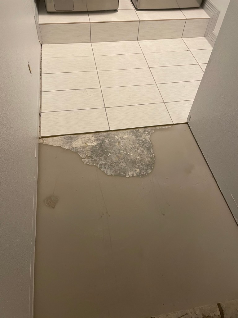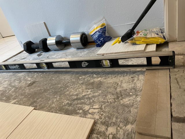 It is 8:40pm and FINALLY a load of laundry was able to be completed. Is the laundry room done, oh heck no…. why? Well, let’s just say there was a VERY low spot between the hall door going into the laundry room. We cheated with the 1/2 bath with the backer board, but that was not going to work here (check out the photo with the level). We had to come up with the next best thing – liquid level. The downside, well you have to let it dry before you can tile, so that delayed things. However, after a week of no laundry being done, work clothes were starting to get slim and did I really want Chad to use my towels? Ok, married forever, this should not be a big deal, well… it is! HA! So the washer and dryer are in, but not without 2 tiles “dying” along the way – so if you look close enough, 2 tiles need to come up this week. It’s all good – laundry is getting done. If you notice there are 2 hand weights in one of the pictures too. Trick to note – if it seems you didn’t get enough glue under a tile, hand weights are PERFECT to help setting them overnight.