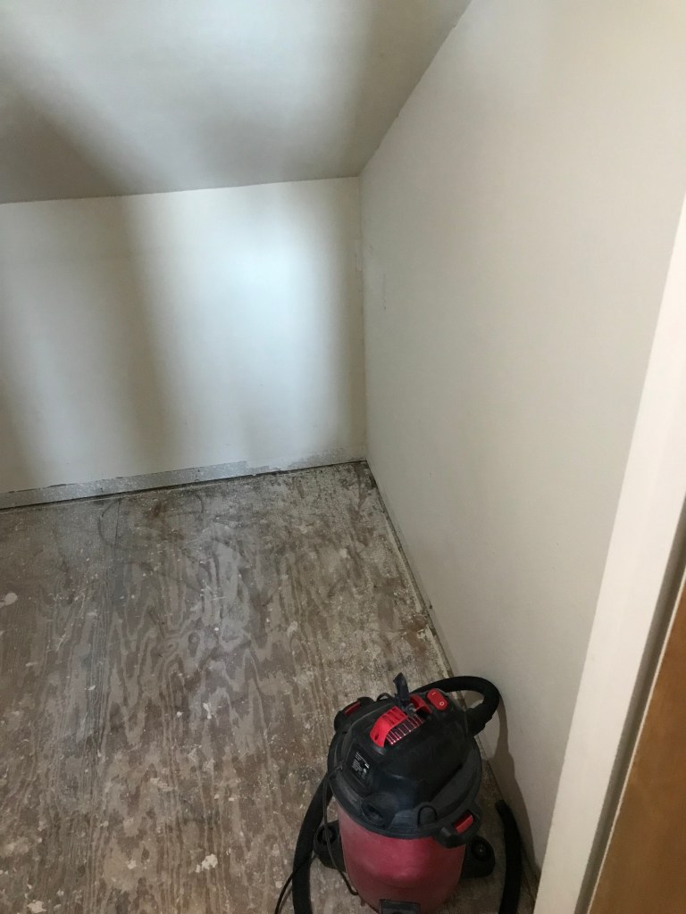 tile is out – notice there is still some tile glue on the floor. Had to do a dinner stop! Best way to get tile glue off is with an oscillating tool and if you keep a shop vac by the grinder, then not a much dust to have to clean up. (which does get ALL over the house, no matter what you try to do).