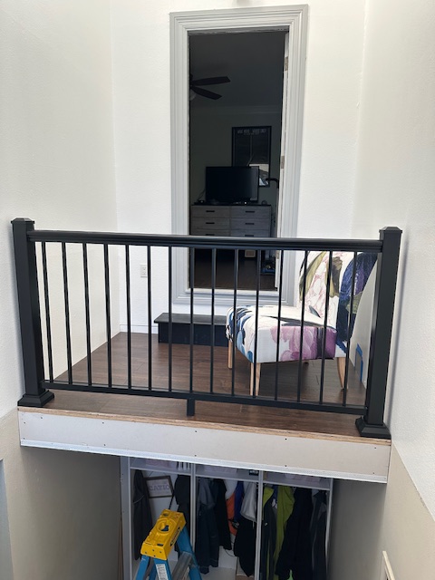 This weekend Chad was on call and did get called out both Saturday and Sunday, so we did what we could with the time we had. We did get the rails up on the landing areas in the Atrium, so now no one can fall to their demise (ok that is probably an overstatement, but I’m sure you could get hurt bad). Gamora IS NOT happy with the rails as we took down her “bridge” to get to the other side. We will be putting up a bridge or cute steps for her, but that did not get done, and she has stood on both sides of the landings letting us know that she is not happy with it. (next weekend Gamora!)