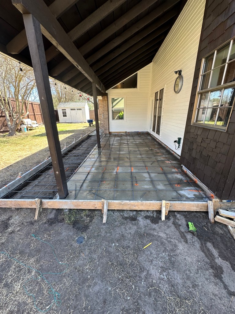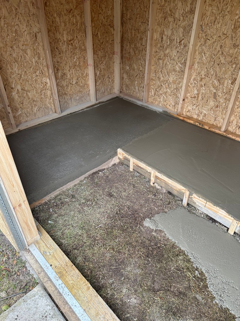 We were outside all weekend as the cold front hitting most of the US will get to us on Monday and through the week, so we took advantage of our warm weather. We put up new outside lights on the house (sorry no pics – they are just lights) and poured all but one section of concrete pad in the shed. Yes, we realize it is easier to have the pad done BEFORE you put up a shed, but when we needed to get going on the shed, we were dealing with our rainy season and it just wasn’t going to work out. We needed the shed up so we can finish up the area above the garage. We purposely put the above the garage off until it is our “winter” as then it won’t or shouldn’t be so unbearably hot up there. Our winter is only about a month or two, so time is limited. 🙂 We have only one more section to pour in the shed, then out side of sealing the walls – it will be done. At least done enough to move some items out there so we can proceed with all of our other plans! Or next weekend when I have plans, finishing the inside of the shed, Chad won’t need an extra set of hands. We’ll figure out what the heck we are doing by next weekend!