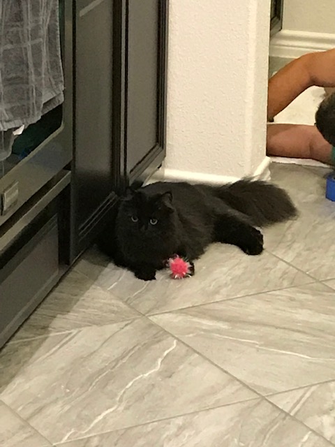 Maize got her toys lost behind the cabinet – we did not know that the construction guys left a hole there. Well Maize and her toys found the hole. Chad was getting them out (hence what he is doing in the background).
