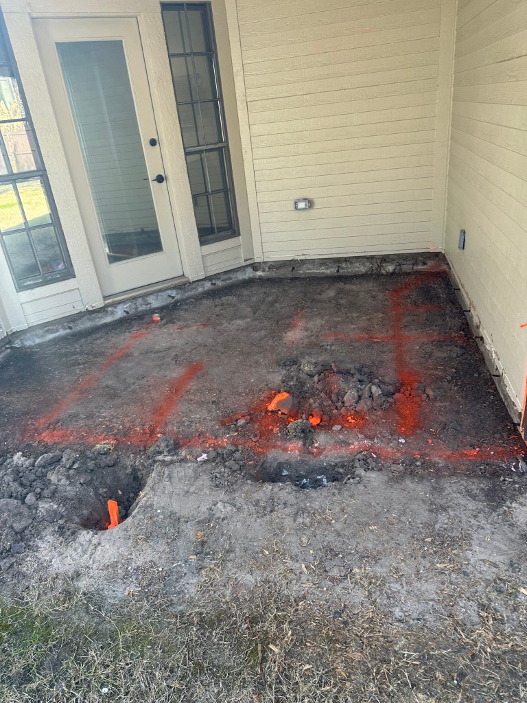 We were able to get the two areas ready for the concrete pads. The picture with just the dirt, was the catio. After many conversations and measurements, this is going to be where the new shower and Rodney bath will go. I have a picture with orange lines – I’m sure that will show all of you how fabulous that will be (kidding, it is a mess)! We decided to keep the laundry room where it is, but going to move the door and move one of the walls as it backs up to the kitchen, so why not just bust down all walls. LOL! The pad that is already poured is where we will be expanding the kitchen, yahoo!!!
