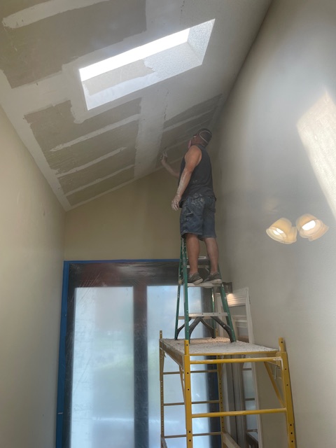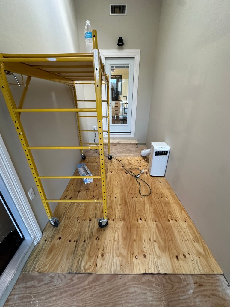 We have had a lot of life events happen, which has caused our delays. I guess since it is football season, school is back in session, we can now get back to the house. Our life events at lease are exciting: Ciera got engaged to Dylan, Ciera and Dylan bought a house (which included a weekend move in there), I’m ending my job with Optum and taking on a new opportunity. The only constant is Chad hasn’t changed a thing. That is really a good thing! So let me get you updated on where we are at. The last post I showed you how we put in the door to the extra bedroom for the landing. We have now put a temporary floor that connects the landing out of Ciera’s bedroom and the extra bedroom so we could get the popcorn ceiling sanded and get things retextured. Chad did get it all sanded, mudded, sanded again, so we are ready for painting. We should be able to get that done this week or definitely next weekend.