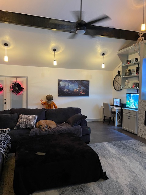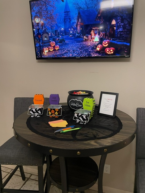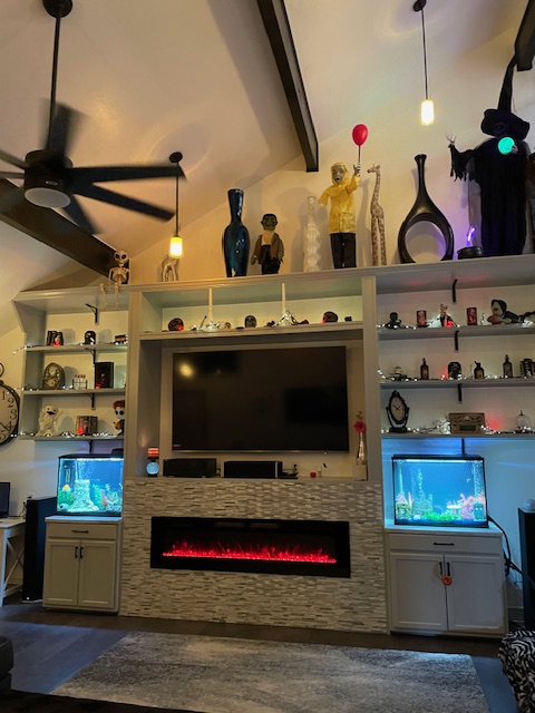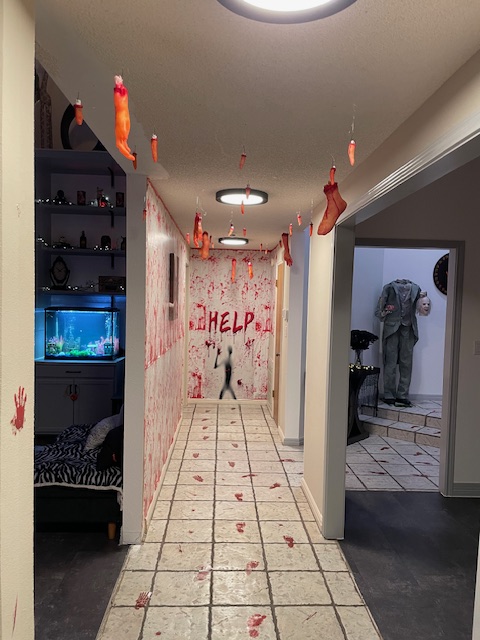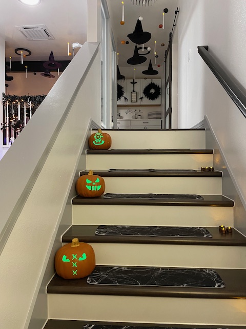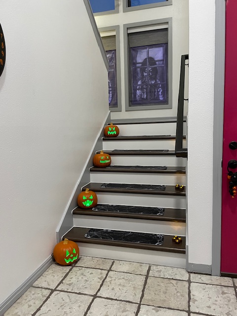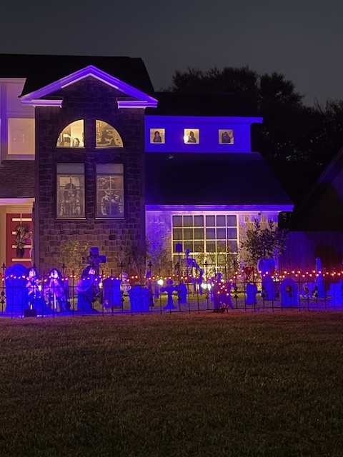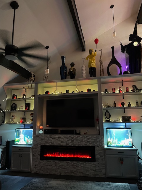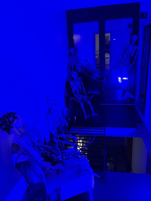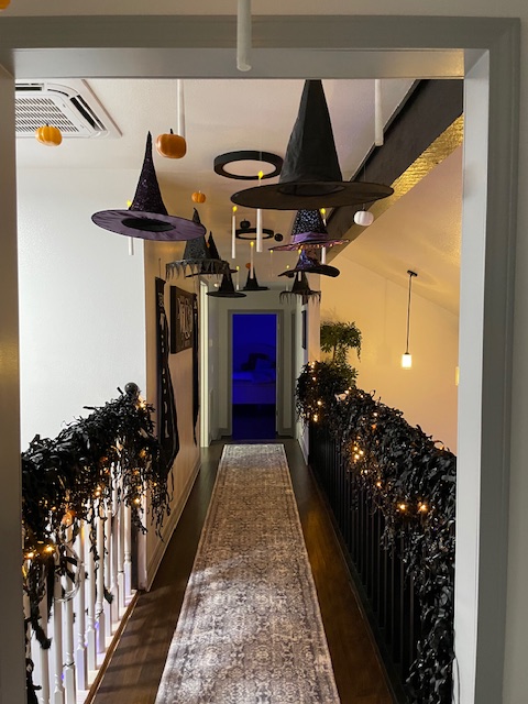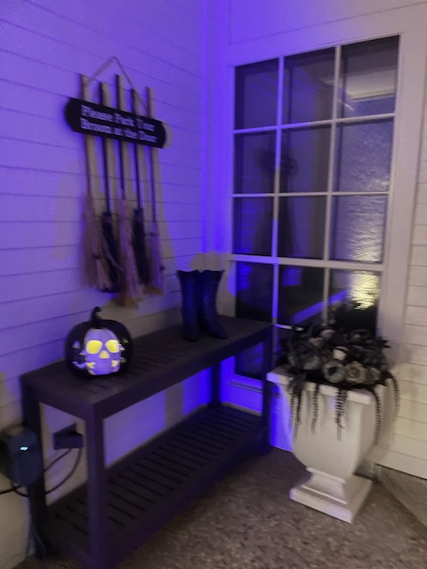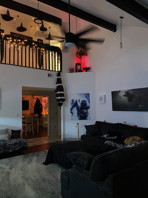 I promised last week that this week’s post would be the inside Halloween photos. I’m disappointed as the iPhone auto adjusts and I’m to tech dumb to get the pictures to look like they do in real life. The photos of the living room with the lights on are really orange, but they don’t look like it in the photos. I turned the lights off and it still didn’t capture things right. Then the atrium area that is in blue, doesn’t matter how still I am, they come out a little blurred – I’m just gonna say a spirit is in that part of the house messing with me. Enjoy!