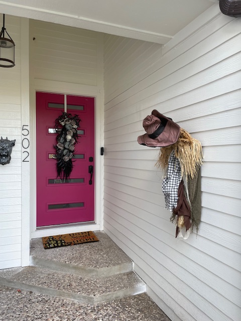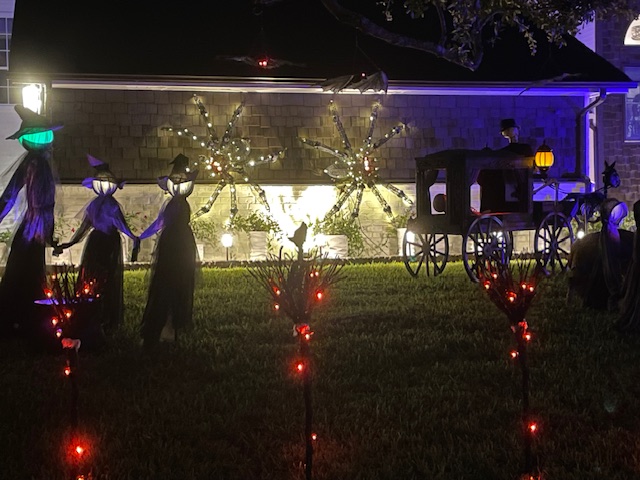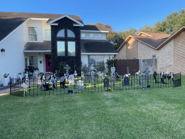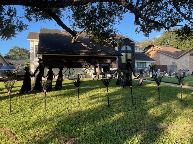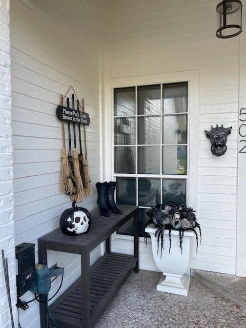 We have all of the outside Halloween decorations up so this post is just about our decorations. Most of the inside is done, but will share those photos next week. Due to the month of all things scary, not much with the house will be done, we have a few outside projects, but not sure if we will get to those. I’ll keep you all posted. I tried to take the same photos in the day and then at night.