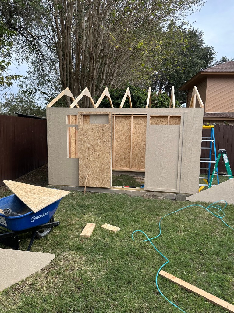 Oh the holiday time is frightful, but remodeling is so delightful…. LOL – Happy holiday season everyone! We decided to build a shed over the Thanksgiving Holiday. Dylan and Ciera were here so Friday, Dylan helped Chad assemble the shed walls while Ciera helped me decorate the house for Christmas. Saturday and Sunday, Chad and I set the roof, got it shingled and windows installed. We need to put the trim on and paint it yet, which will probably be a couple weeks out as we have plans the next 2 weekends. However, if we can sneak anything in, we definitely will. Chad is super excited as once this is done, then he knows we will get to remodel the garage (for him that is like me building an office).